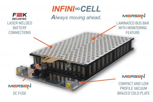 與傳統(tǒng)的電池互連解決方案不同,F(xiàn) & K DELVOTEC 激光焊接機(jī)接口可確保電池單元與層壓母線的高速、安全、穩(wěn)健和高效連接。這種方法比傳統(tǒng)的線/帶插入和焊接快四倍多。疊層母線是具有交錯觸點的超薄單層。母線也是一種“智能”母線,這意味著它不僅可以為電池供電,還可以根據(jù)需要監(jiān)控電池的溫度和電壓。匯流條還消除了接線錯誤,并在電動汽車安裝中提供了額外的抗沖擊和振動強(qiáng)度。為了保護(hù)電池組件免受過電流的影響,安裝了一個特殊的低瓦特?fù)p耗/高循環(huán)直流額定保險絲。然后將電池組件固定在超緊湊(僅 7 毫米厚)的液冷冷板上,為所有電池單元提供均勻冷卻。