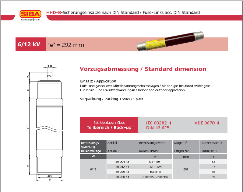 Siba高壓熔斷器6KV/12KV