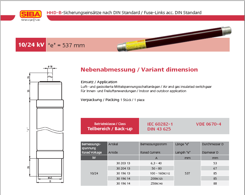 Siba高壓熔斷器10KV/24KV